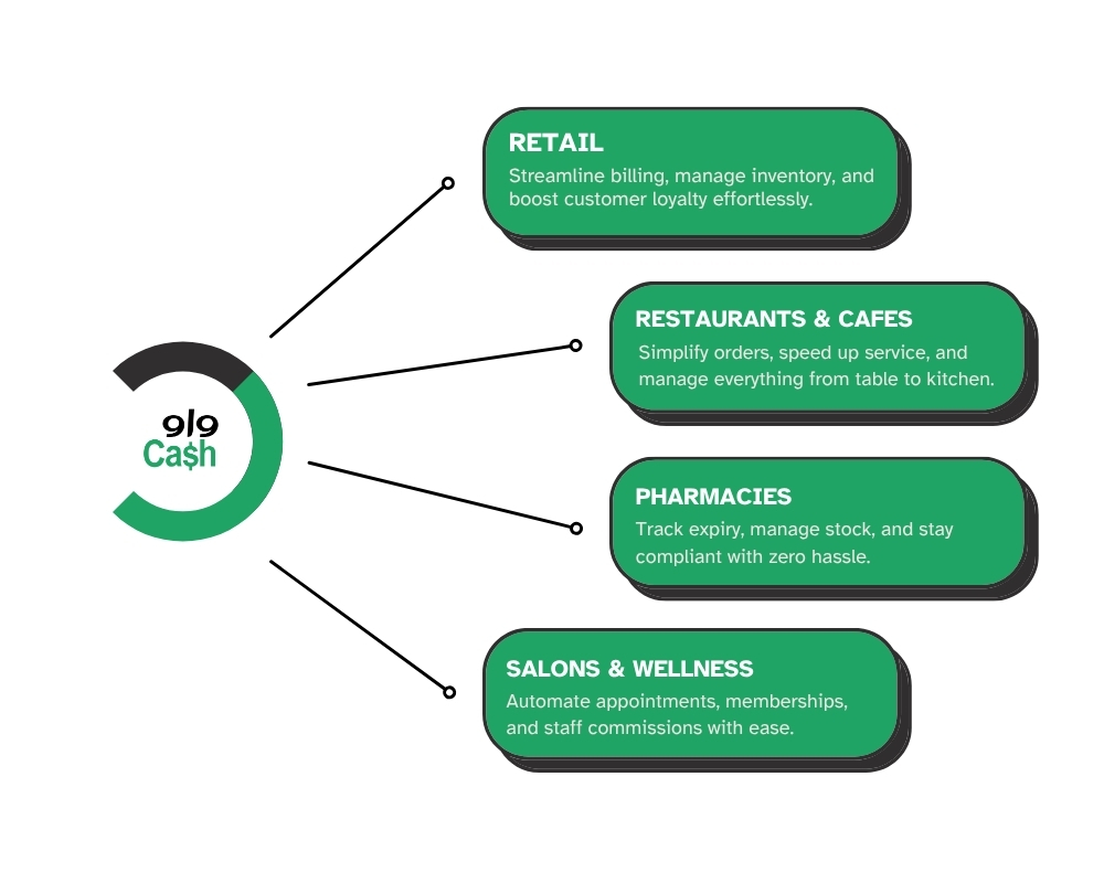 من متاجر التجزئة إلى المطاعم، ومن صالونات التجميل إلى الصيدليات، تقدم WAW CASH أدوات مصممة خصيصًا لتلبية الاحتياجات الفريدة لكل قطاع. صُممت حلولنا لتبسيط العمليات، وتعزيز الكفاءة، وتحقيق نتائج ملموسة – أيًا كان مجال عملك.